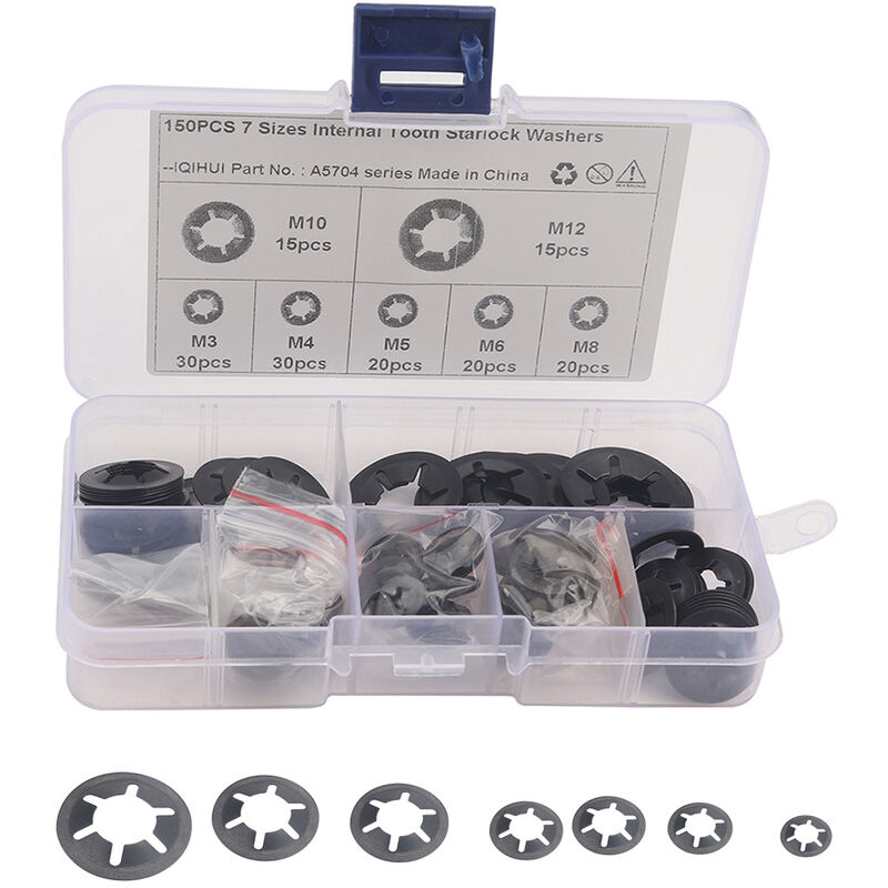 STATI UNITI attenzione del compratore:Le aree in cui il magazzino DEGLI STATI UNITI non trasportare le merci sono: Hawaii,Alaska, Puerto Rico, Guam e altri US all'estero territori. E ilIndirizzo militare. Spagnolo di attenzione degli acquirenti:Se il vostro indirizzo comprende i seguenti codice postale si prega di non scegliere la Spagnola magazzino.Il codice di avviamento postale inizia con 35/38.All'estero magazzino non può essere consegnato. 150pcs Dente Interno Star Rondelle di sicurezza Assortimento Kit 7 Dimensioni M3 M4 M5 M6 M8 M10 M12 Push-on rondelle di bloccaggio Rapido Velocità Star Dado di Bloccaggio Pinze di FissaggioCaratteristica:1. It è fatto di materiali di alta qualità e ha una lunga durata di vita;