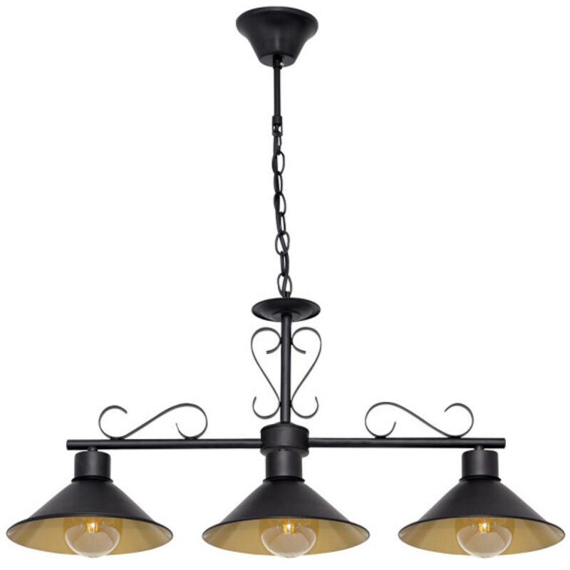 Sospensione a tre luci della serie AZALEA di colore NERO/ORO. Realizzato in metallo. Il suo design offre una versione sofisticata dello stile rustico, presentando l'interno dei suoi paralumi in oro e i suoi paralumi disposti in modo lineare. È ideale per grandi stanze in case di campagna o case con relativi stili decorativi. Si consiglia vivamente di completare con alcune bellissime lampadine decorative vintage a filamento, che insieme al colore dorato forniscono un tono caldo alla stanza che decorano. Ha tre portalampada E27. Lampadine non incluse. La sua altezza è regolabile in altezza e ha una dimensione di 54 & lt, 74x86x20 centimetri.
