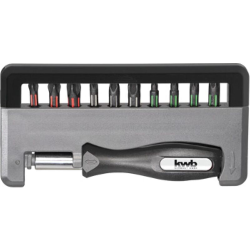 12 pezzi. Set che si adatta a qualsiasi camicia o tasca del pantaloni. Contiene un cacciavite corretto con supporto per magnete rimovibile per cacciaviti cordless. Dotato di bit di torsione specificamente per la vittima rigida. La zona di torsione appositamente progettata protegge il bit ad effetti ad alta forza prima di rompere. In modo che il bitform possa essere riconosciuto a colpo d'occhio, i bit KWB sono contrassegnati con una pratica striscia di colori.