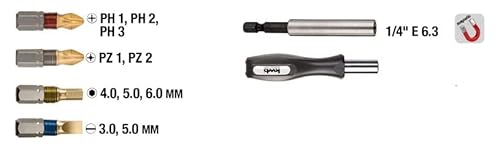 Sono inclusi i seguenti bit di lunghezza di 25 mm con anello colorato identificativo: 1x PH 1, PH 2, PH 3, P, 2, P, 3, presa esagonale 4 / 5 / 6 mm, slot 3 mm e 5 mm.