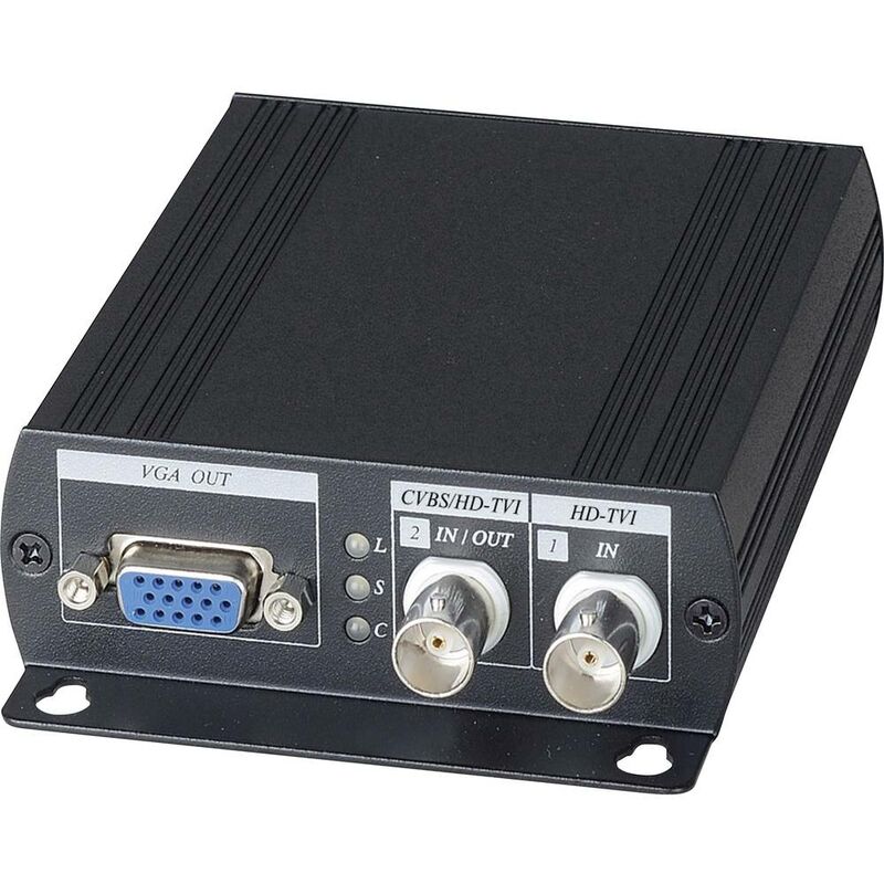 Dettagli tecnici Canali (LOV - solo per titolo) 1 canale Dimensione del prodotto, larghezza 80 mm Dimensioni (L x A) 80 mm x 26 mm Dimensioni prodotto Altezza 26 mm Numero canali 1 Peso 199 g Tipo prodotto Convertitore SDI-HDMI Ingresso video: HD-TVI tramite BNC (compatibile con SMPTE-292M/296M) Uscita video: 1 HDMI Larghezza di banda 1,485 Gbps Assorbimento di corrente: circa 800mA Alimentazione: tramite alimentatore (non incluso) 100 V a 240 V/AC (50/60 Hz), tensione d'ingresso 12 V/DC (1 A consigliato) Umidità dell'aria consigliata: da 5 fino a 90% (senza condensa) Colore: grigio argento. Materiale dell'alloggiamento: alluminio Convertitore video HD-TVI a HDMI State progettando di acquistare una telecamera di sorveglianza HD-TVI, HD-CVI o AHD, ma avete paura di acquistare costosi monitor speciali e non avete un registratore digitale adatto per registrare le immagini della fotocamera? Volete solo vedere cosa succede davanti alla vostra porta d'ingresso dalla poltrona TV? Non dovrete