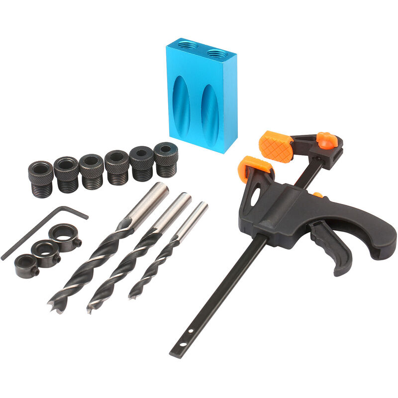 Specifica: Set: Set 8 pezzi/ Set 14 pezzi/ Set 15ocs (opzionale) Set 8 pezzi: 1 guida per trapano + 6 manicotti + clip a F Set da 14 pezzi: 1 guida per trapano + 6 manicotti + 3 punte + 3 tappi + chiave esagonale Set da 15 pezzi: 1 centrapunte + 6 manicotti + 3 punte + 3 tappi + chiave esagonale + clip a F Colore: blu + nero Materiale punta: acciaio al carbonio< br /> Materiale dell'anello: acciaio al carbonio Materiale del posizionatore: alluminio F-Clip: ABS Dimensioni del posizionatore: ca. 67 * 38 * 18 mm Diametro punta: 6 mm, 8 mm, 10 mm Dimensioni tappo: 6 mm, 8 mm, 10 mm Manicotto Dimensioni: 6 mm, 8 mm, 10 mm Angolo: 15 gradi Lista di imballaggio: 1 * Guida per trapano 3 * Punte per trapano (6 mm, 8 mm, 10 mm) 3 * Tappi (6 mm, 8 mm, 10 mm) 6 * Manicotti (6mm, 8mm, 10mm) 1 * Chiave esagonale 1 * F Clip