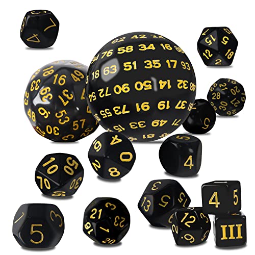 La confezione contiene 15 dadi poliedrici, D3, D4, D5, D6, D7, D%, D8, D10, D12, D16, D20, D24, D30, D60 e D100, un set completo di dadi per le vostre esigenze di gioco da tavolo.
