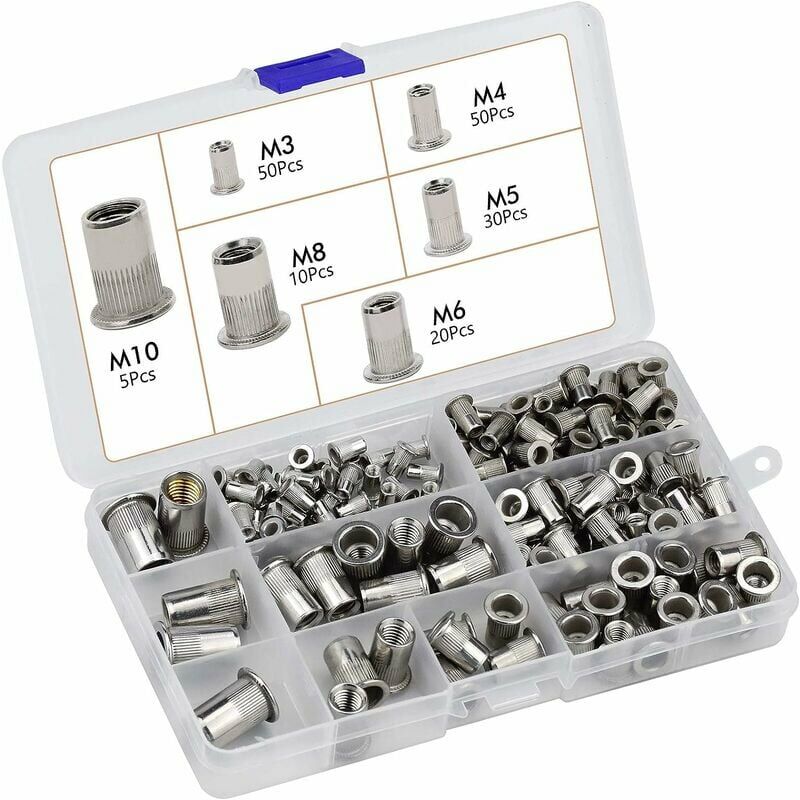 Buone prestazioni. - Questo rivetto a testa piatta ha una buona funzione di fissaggio e può essere facilmente installato in molti materiali diversi, come acciaio, plastica e fibra di vetro. 【Robusto e durevole.】 Realizzato di acciaio inossidabile 304, che è adatto per Garantisce resistenza, ha un corpo robusto senza proprietà di ruggine. I dadi hanno una superficie indurita che fornisce filettature portanti ad alta resistenza. 【Design professionale】 Il corpo scanalato offre una migliore resistenza alla rotazione rispetto ai tradizionali dadi per rivetti non scanalati, presenta un grande area di contatto e aiuta a migliorare la retrazione della punta. 【Varie dimensioni. 】 Ci sono varie dimensioni, M3, M4, M5, M6, M8, M10 tra cui scegliere, viene fornito con una comoda scatola di plastica, facile da organizzare e utilizzare la prossima volta, rendendo il tuo lavoro più facile e veloce. p> Caratteristica - Kit dado rivetto/Strumento di installazione: manuale/pneumatico disponibile.