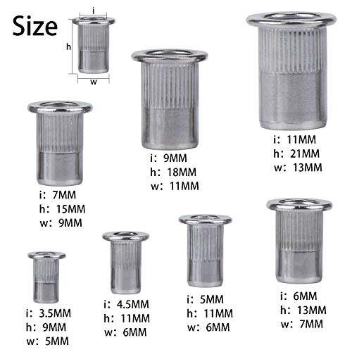 Soddisfa diverse esigenze: ci sono 6 tipi di dimensioni popolari tra cui scegliere: M3, M4, M5, M6, M8, M10. Quantità della confezione: 165 pezzi. I dadi per rivetti di diverse dimensioni sono separati e conservati in cinghie che puoi trovare rapidamente le dimensioni appropriate che desideri