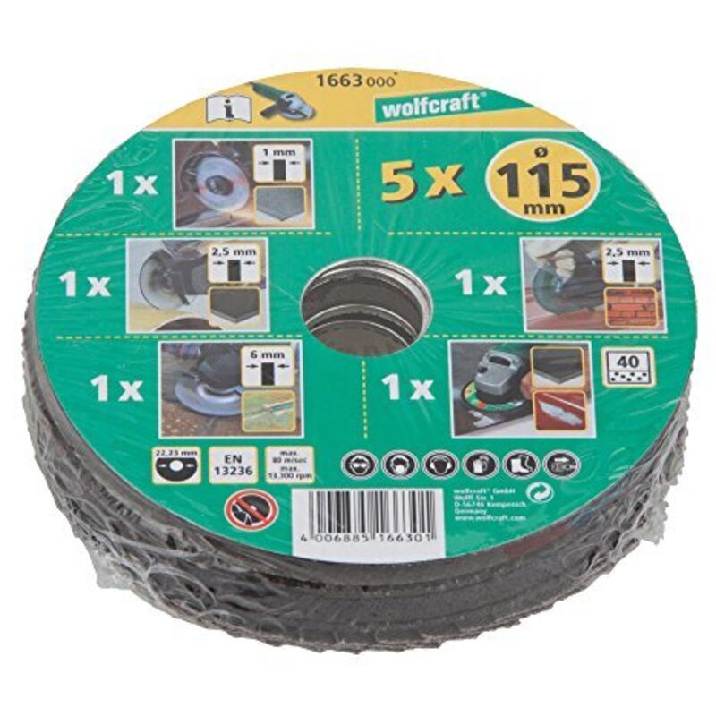 Colore: Nero Diametro: 115 mm Diametro del foro: 22,2 mm Per smerigliatrici angolari Confezionati con pellicola termoretraibile Contenuto: Questo set di avvio della Wolfcraft, include 5 dischi ed è perfetto per le smerigliatrici angolari. Tutti i dischi hanno un diametro di 115 mm e un diametro del foro di 22,2 mm. La consegna include: 1 disco da taglio fine in metallo, 1 disco da taglio in metallo, 1 disco da taglio in pietra, 1 disco per metallo e 1 disco lamellare in metallo, grana 40. I dischi sono avvolti con pellicola termoretraibile. Colore: Nero Diametro: 115 mm Diametro del foro: 22,2 mm Per smerigliatrici angolari Confezionati con pellicola termoretraibile Contenuto: 1 Disco da taglio fine, metallo 1 Disco da taglio, metallo 1 Disco da taglio, pietra 1 Disco per smerigliatura, metallo 1 Disco lamellare, metallo, grana 40