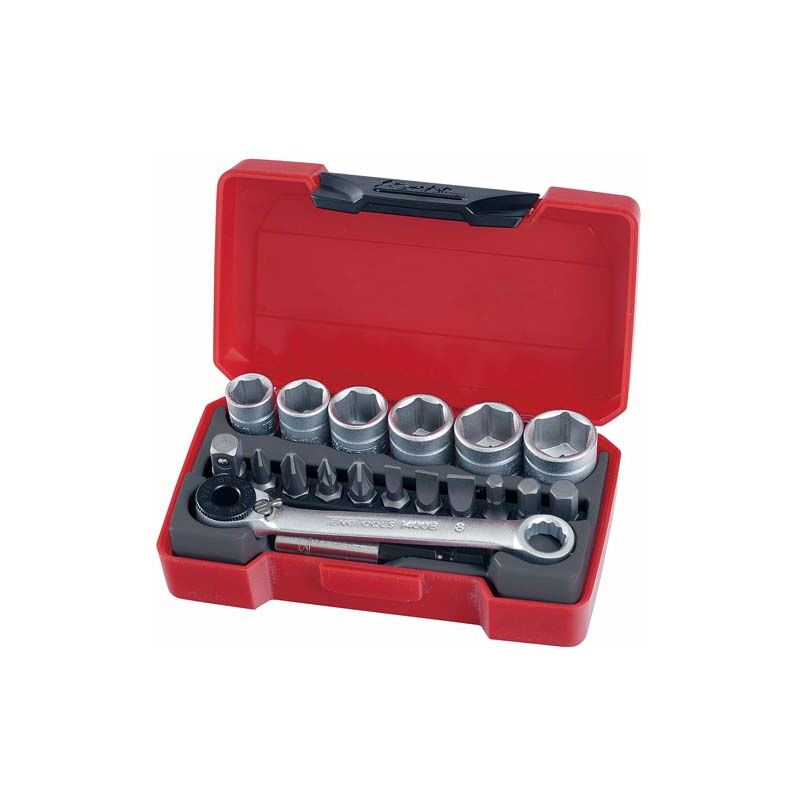 Set di chiavi a bussola da 1/4? di 19 pezzi. Contiene mini cricchetto da 1/4", 6 chiavi a bussola esagonali, adattatore esagonale da 1/4", 10 inserti, portainserti magnetico da 50 mm. In scatola di plastica con chiusura a scatto e cerniera con asta in metallo.