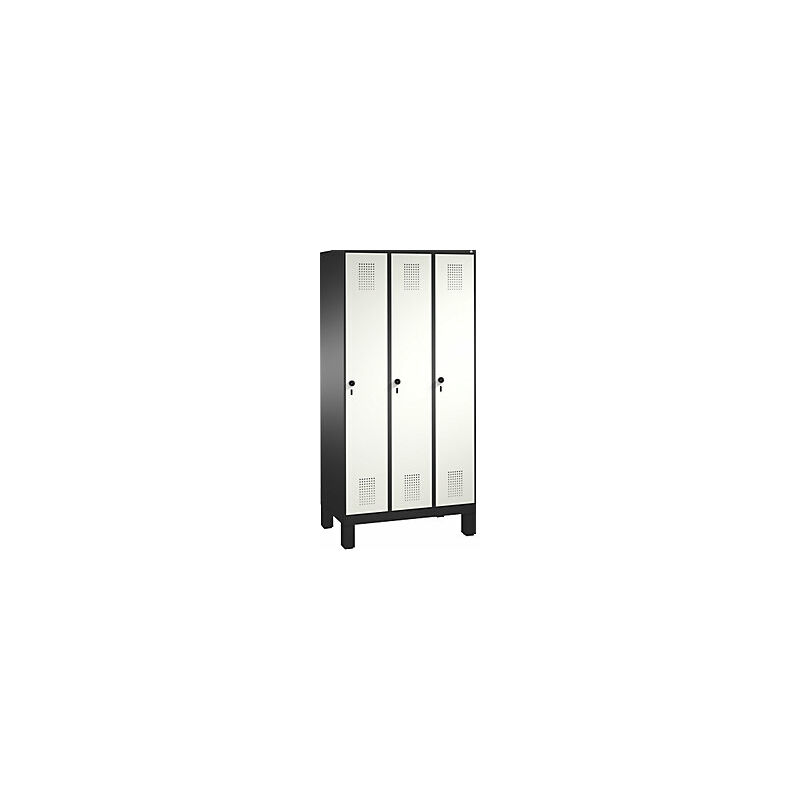 Armadietto guardaroba EVOLO, con piedini, 3 vani, larghezza vani 300 mm, grigio nerastro / bianco traffico. Fornitura = montato. Altezza = 1850 mm. Profondità = 500 mm. Larghezza = 900 mm. Colore corpo = grigio nerastro RAL 7021. Colore porta = bianco traffico RAL 9016. Serratura = chiavistello girevole di sicurezza per lucchetto. Numero scomparti in larghezza = 3 pz. Numero scomparti = 3 pz. Larghezza scomparti = 300 mm. Materiale = lamiera d'acciaio. Altezza armadietto = 1850 mm. Dotazione interna = 1 ripiano, 1 asta appendiabiti con 3 ganci scorrevoli. Larghezza interna = 245 mm. Altezza interna = 1600 mm. Profondità interna = 465 mm. Tipo di porta = ante con fessure di ventilazione. Altezza scomparti = 1600 mm. Larghezza ripiani = 300 mm. Profondità ripiani = 500 mm. Altezza piedini = 150 mm. Struttura = con saldatura. Superficie = con verniciatura a forno. All'interno di ogni vano 1 piano d'appoggio, 1 robusta asta appendiabiti a sezione ovale con 3 ganci scorrevoli antitorsione.