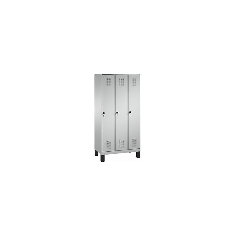 Armadietto guardaroba EVOLO, con piedini, 3 vani, larghezza vani 300 mm, alluminio brillante / alluminio brillante. Fornitura = montato. Altezza = 1850 mm. Profondità = 500 mm. Larghezza = 900 mm. Colore corpo = alluminio brillante RAL 9006. Colore porta = alluminio brillante RAL 9006. Serratura = chiavistello girevole di sicurezza per lucchetto. Numero scomparti in larghezza = 3 pz. Numero scomparti = 3 pz. Larghezza scomparti = 300 mm. Materiale = lamiera d'acciaio. Altezza armadietto = 1850 mm. Dotazione interna = 1 ripiano, 1 asta appendiabiti con 3 ganci scorrevoli. Larghezza interna = 245 mm. Altezza interna = 1600 mm. Profondità interna = 465 mm. Tipo di porta = ante con fessure di ventilazione. Altezza scomparti = 1600 mm. Larghezza ripiani = 300 mm. Profondità ripiani = 500 mm. Altezza piedini = 150 mm. Struttura = con saldatura. Superficie = con verniciatura a forno. All'interno di ogni vano 1 piano d'appoggio, 1 robusta asta appendiabiti a sezione ovale con 3 ganci