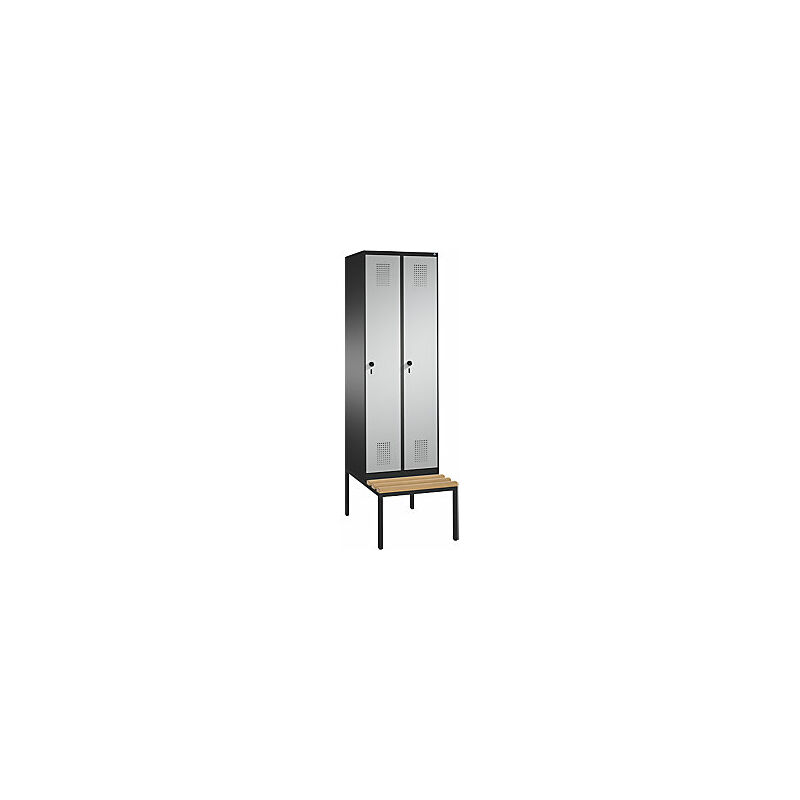 Armadietto guardaroba EVOLO, con panca, 2 vani, larghezza vani 300 mm, grigio nerastro / alluminio brillante. Fornitura = montato. Altezza = 2090 mm. Larghezza = 600 mm. Profondità = 815 mm. Colore corpo = grigio nerastro RAL 7021. Colore porta = alluminio brillante RAL 9006. Serratura = chiavistello girevole di sicurezza per lucchetto. Numero scomparti in larghezza = 2 pz. Materiale = lamiera d'acciaio. Larghezza scomparti = 300 mm. Profondità scomparti = 500 mm. Dotazione interna = 1 ripiano, 1 asta appendiabiti con 3 ganci scorrevoli. Altezza sedile = 420 mm. Profondità sedile = 315 mm. Profondità armadio = 500 mm. Tipo di porta = ante piene. Colore doghe = faggio. Colore telaio = nero. Versione = con panca integrata. Serie = EVOLO. Larghezza interna = 245 mm. Altezza interna = 1600 mm. All'interno di ogni vano 1 piano d'appoggio, 1 robusta asta appendiabiti a sezione ovale con 3 ganci scorrevoli antitorsione. Panca integrata con piedini regolabili per la semplice messa in piano
