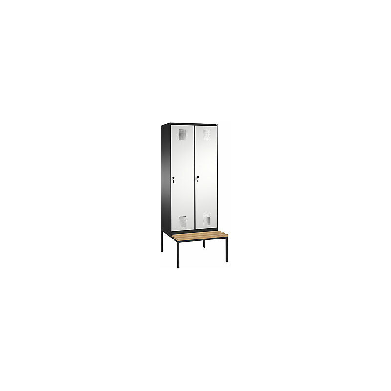 Armadietto guardaroba EVOLO, con panca, 2 vani, larghezza vani 400 mm, grigio nerastro / grigio chiaro. Fornitura = montato. Altezza = 2090 mm. Larghezza = 800 mm. Profondità = 815 mm. Colore corpo = grigio nerastro RAL 7021. Colore porta = grigio chiaro RAL 7035. Serratura = chiavistello girevole di sicurezza per lucchetto. Numero scomparti in larghezza = 2 pz. Materiale = lamiera d'acciaio. Larghezza scomparti = 400 mm. Profondità scomparti = 500 mm. Dotazione interna = 1 ripiano, 1 asta appendiabiti con 3 ganci scorrevoli. Altezza sedile = 420 mm. Profondità sedile = 315 mm. Profondità armadio = 500 mm. Tipo di porta = ante piene. Colore doghe = faggio. Colore telaio = nero. Versione = con panca integrata. Serie = EVOLO. Larghezza interna = 345 mm. Altezza interna = 1600 mm. All'interno di ogni vano 1 piano d'appoggio, 1 robusta asta appendiabiti a sezione ovale con 3 ganci scorrevoli antitorsione. Panca integrata con piedini regolabili per la semplice messa in piano fino a 10 mm.