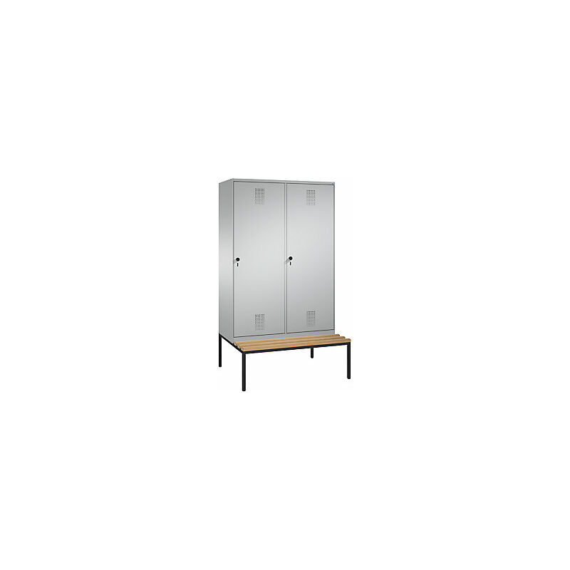 Armadietto guardaroba EVOLO, con panca, anta sopra 2 vani, 4 vani, 2 ante, larghezza vani 300 mm, alluminio brillante / alluminio brillante. Fornitura = montato. Altezza = 2090 mm. Larghezza = 1200 mm. Profondità = 815 mm. Colore corpo = alluminio brillante RAL 9006. Colore porta = alluminio brillante RAL 9006. Serratura = chiavistello girevole di sicurezza per lucchetto. Numero scomparti in larghezza = 4 pz. Materiale = lamiera d'acciaio. Larghezza scomparti = 300 mm. Profondità scomparti = 500 mm. Dotazione interna = 1 cappelliera, 1 asta appendiabiti con 3 ganci, 1 parete divisoria centrale. Altezza sedile = 420 mm. Profondità sedile = 315 mm. Profondità armadio = 500 mm. Tipo di porta = ante piene. Colore doghe = faggio. Colore telaio = nero. Versione = con panca integrata. Serie = EVOLO. Larghezza interna = 245 mm. Altezza interna = 1600 mm. 1 anta sopra 2 vani, battuta a destra, supporto su perni. All'interno 1 piano d'appoggio per vano, 1 robusta asta appendiabiti a sezione