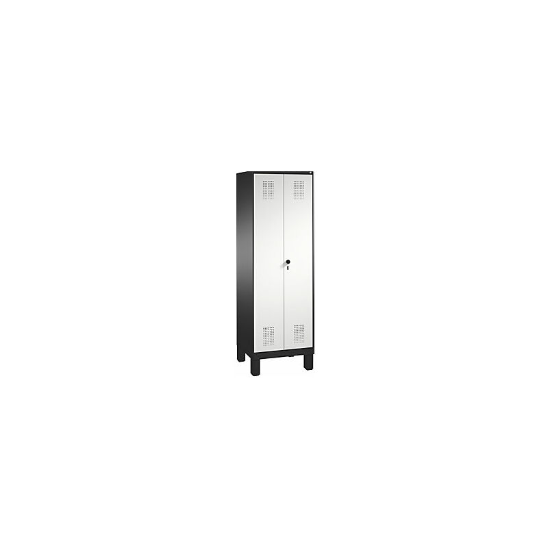 Armadio di magazzinaggio EVOLO, ante battenti, con piedini, 2 vani, 8 ripiani, larghezza vani 300 mm, grigio nerastro / grigio chiaro. Fornitura = montato. Altezza = 1850 mm. Profondità = 500 mm. Larghezza = 600 mm. Colore corpo = grigio nerastro RAL 7021. Colore porta = grigio chiaro RAL 7035. Serratura = chiavistello girevole di sicurezza per lucchetto. Numero scomparti in larghezza = 2 pz. Numero scomparti = 8 pz. Larghezza scomparti = 300 mm. Materiale = lamiera d'acciaio. Altezza armadietto = 1850 mm. Dotazione interna = parete divisoria e 2x4 ripiani. Larghezza interna = 2x245 mm. Profondità interna = 465 mm. Tipo di porta = 2 ante a battente. Larghezza ripiani = 245 mm. Profondità ripiani = 500 mm. Altezza piedini = 150 mm. Struttura = con saldatura. Superficie = con verniciatura a forno. Con parete divisoria centrale. Con parete divisoria centrale, 2 ante a battente con serratura unica, supporto su perni, all'interno di ogni vano 4 piani d'appoggio. Su piedini in plastica