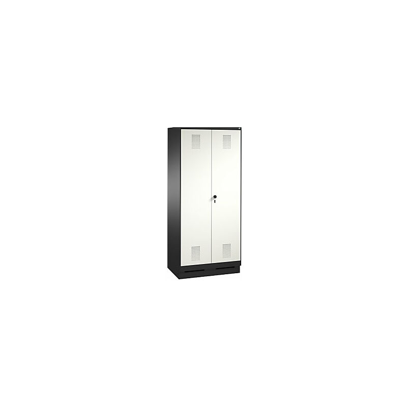 Armadietto guardaroba e per biancheria EVOLO, 4 ripiani, asta appendiabiti, 2 vani di 400 mm, con zoccolino, grigio nerastro / bianco traffico. Fornitura = montato. Altezza = 1800 mm. Profondità = 500 mm. Larghezza = 800 mm. Colore corpo = grigio nerastro RAL 7021. Colore porta = bianco traffico RAL 9016. Serratura = chiavistello girevole di sicurezza per lucchetto. Numero scomparti in larghezza = 1 pz. Numero scomparti = 5 pz. Larghezza scomparti = 400 mm. Materiale = lamiera d'acciaio. Altezza armadietto = 1800 mm. Dotazione interna = 4 ripiani fissi a sinistra, guardaroba con cappelliera e asta appendiabiti a destra. Larghezza interna = 345 mm. Altezza interna = 1600 mm. Profondità interna = 465 mm. Tipo di porta = ante con fessure di ventilazione. Larghezza ripiani = 400 mm. Profondità ripiani = 500 mm. Altezza zoccolo = 100 mm. Struttura = con saldatura. Superficie = con verniciatura a forno. Con parete divisoria centrale, a sinistri 4 ripiani fissi, a destra piano d'appoggio e
