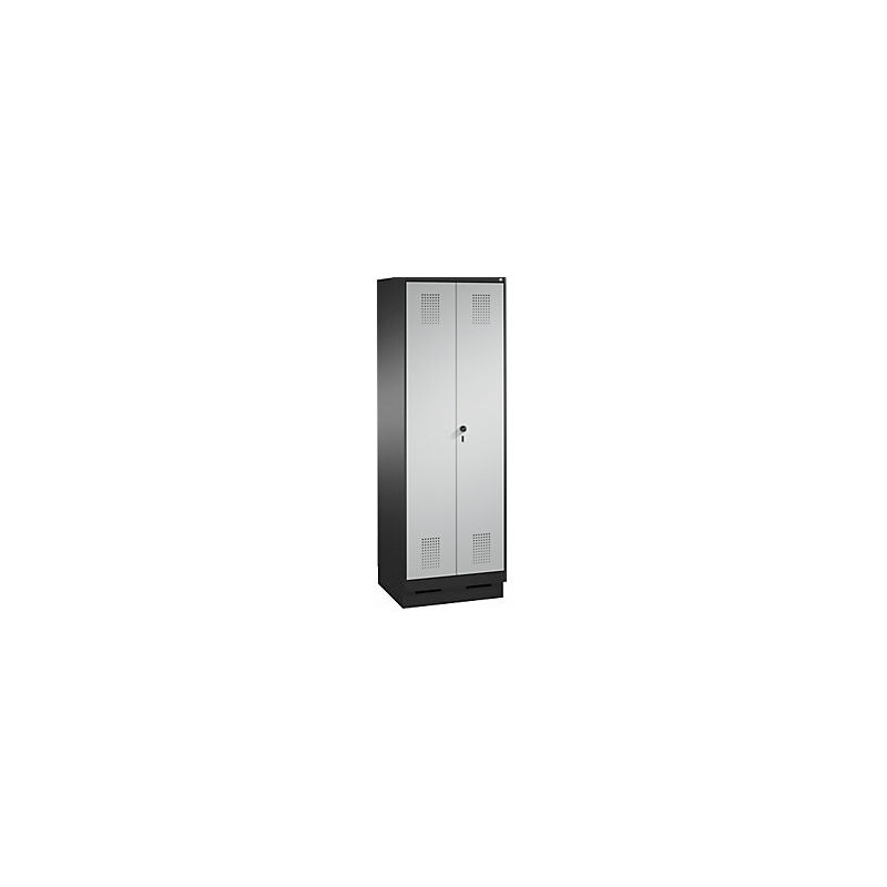 Armadio di magazzinaggio EVOLO, ante battenti, con zoccolino, 1 vano, larghezza 600 mm, con 4 ripiani, grigio nerastro / alluminio brillante. Fornitura = montato. Altezza = 1800 mm. Profondità = 500 mm. Larghezza = 600 mm. Colore corpo = grigio nerastro RAL 7021. Colore porta = alluminio brillante RAL 9006. Serratura = chiavistello girevole di sicurezza per lucchetto. Numero scomparti in larghezza = 1 pz. Numero scomparti = 5 pz. Larghezza scomparti = 600 mm. Materiale = lamiera d'acciaio. Altezza armadietto = 1800 mm. Dotazione interna = 4 ripiani fissi. Larghezza interna = 545 mm. Profondità interna = 465 mm. Tipo di porta = 2 ante a battente. Larghezza ripiani = 600 mm. Profondità ripiani = 500 mm. Altezza zoccolo = 100 mm. Struttura = con saldatura. Superficie = con verniciatura a forno. 2 ante battenti con serratura unica, supporto su perni, all'interno 4 piani d'appoggio, su zoccolino alto 100 mm. Chiavistello girevole di sicurezza per chiusura con lucchetto. Viene consegnato