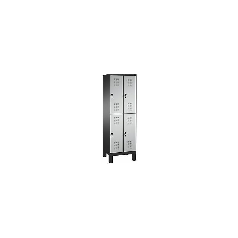 Armadietto guardaroba EVOLO, a due piani, con piedini, 2 vani, 2 scomparti per vano, larghezza vani 300 mm, grigio nerastro / alluminio brillante. Fornitura = montato. Altezza = 1850 mm. Profondità = 500 mm. Larghezza = 600 mm. Colore corpo = grigio nerastro RAL 7021. Colore porta = alluminio brillante RAL 9006. Serratura = chiavistello girevole di sicurezza per lucchetto. Numero scomparti in larghezza = 2 pz. Numero scomparti = 4 pz. Larghezza scomparti = 300 mm. Materiale = lamiera d'acciaio. Altezza armadietto = 1850 mm. Dotazione interna = 1 asta appendiabiti, 3 ganci scorrevoli. Larghezza interna = 245 mm. Altezza interna = 813 mm. Profondità interna = 465 mm. Tipo di porta = ante con fessure di ventilazione. Altezza scomparti = 813 mm. Larghezza ripiani = 300 mm. Profondità ripiani = 500 mm. Altezza piedini = 150 mm. Struttura = con saldatura. Superficie = con verniciatura a forno. Lo scomparto è dotato di 1 robusta asta appendiabiti a sezione ovale con 3 ganci scorrevoli