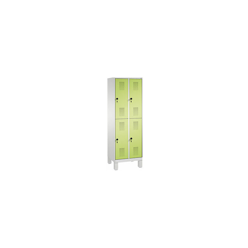 Armadietto guardaroba EVOLO, a due piani, con piedini, 2 vani, 2 scomparti per vano, larghezza vani 300 mm, grigio chiaro / verdino. Fornitura = montato. Altezza = 1850 mm. Profondità = 500 mm. Larghezza = 600 mm. Colore corpo = grigio chiaro RAL 7035. Colore porta = verde azzurrognolo RDS 1108060. Serratura = chiavistello girevole di sicurezza per lucchetto. Numero scomparti in larghezza = 2 pz. Numero scomparti = 4 pz. Larghezza scomparti = 300 mm. Materiale = lamiera d'acciaio. Altezza armadietto = 1850 mm. Dotazione interna = 1 asta appendiabiti, 3 ganci scorrevoli. Larghezza interna = 245 mm. Altezza interna = 813 mm. Profondità interna = 465 mm. Tipo di porta = ante con fessure di ventilazione. Altezza scomparti = 813 mm. Larghezza ripiani = 300 mm. Profondità ripiani = 500 mm. Altezza piedini = 150 mm. Struttura = con saldatura. Superficie = con verniciatura a forno. Lo scomparto è dotato di 1 robusta asta appendiabiti a sezione ovale con 3 ganci scorrevoli antitorsione. Piedini