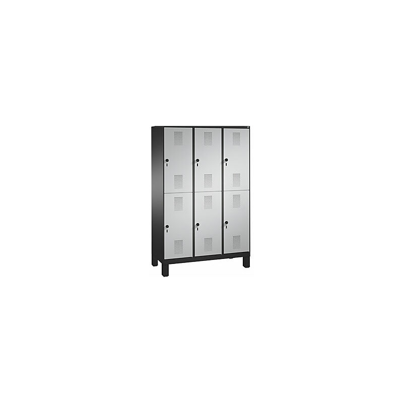 Armadietto guardaroba EVOLO, a due piani, con piedini, 3 vani, 2 scomparti per vano, larghezza vani 400 mm, grigio nerastro / alluminio brillante. Fornitura = montato. Altezza = 1850 mm. Profondità = 500 mm. Larghezza = 1200 mm. Colore corpo = grigio nerastro RAL 7021. Colore porta = alluminio brillante RAL 9006. Serratura = chiavistello girevole di sicurezza per lucchetto. Numero scomparti in larghezza = 3 pz. Numero scomparti = 6 pz. Larghezza scomparti = 400 mm. Materiale = lamiera d'acciaio. Altezza armadietto = 1850 mm. Dotazione interna = 1 asta appendiabiti, 3 ganci scorrevoli. Larghezza interna = 345 mm. Altezza interna = 813 mm. Profondità interna = 465 mm. Tipo di porta = ante con fessure di ventilazione. Altezza scomparti = 813 mm. Larghezza ripiani = 400 mm. Profondità ripiani = 500 mm. Altezza piedini = 150 mm. Struttura = con saldatura. Superficie = con verniciatura a forno. Lo scomparto è dotato di 1 robusta asta appendiabiti a sezione ovale con 3 ganci scorrevoli