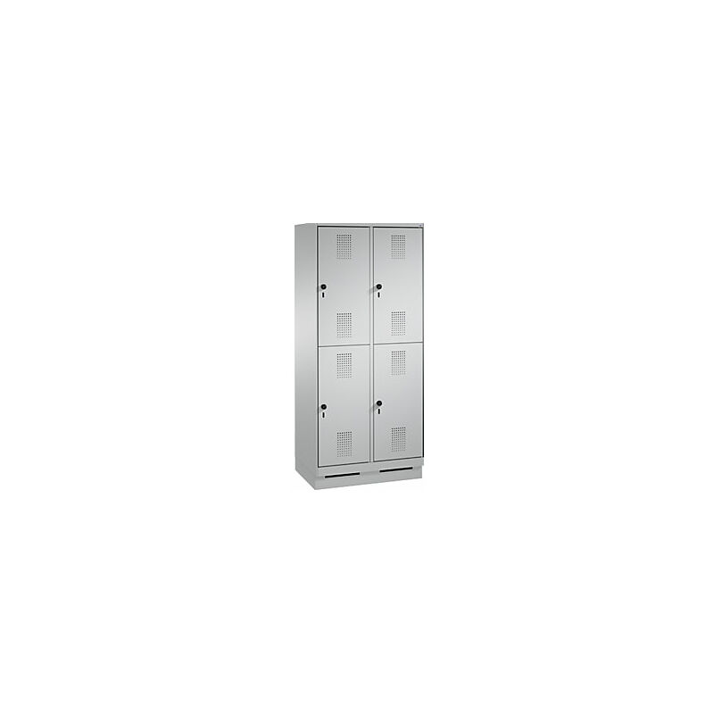 Armadietto guardaroba EVOLO, a due piani, con zoccolino, 2 vani, 2 scomparti per vano, larghezza vani 400 mm, alluminio brillante / alluminio brillante. Fornitura = montato. Altezza = 1800 mm. Profondità = 500 mm. Larghezza = 800 mm. Colore corpo = alluminio brillante RAL 9006. Colore porta = alluminio brillante RAL 9006. Serratura = chiavistello girevole di sicurezza per lucchetto. Numero scomparti in larghezza = 2 pz. Numero scomparti = 4 pz. Larghezza scomparti = 400 mm. Materiale = lamiera d'acciaio. Altezza armadietto = 1800 mm. Dotazione interna = 1 asta appendiabiti, 3 ganci scorrevoli. Larghezza interna = 345 mm. Altezza interna = 813 mm. Profondità interna = 465 mm. Tipo di porta = ante con fessure di ventilazione. Altezza scomparti = 813 mm. Larghezza ripiani = 400 mm. Profondità ripiani = 500 mm. Altezza zoccolo = 100 mm. Struttura = con saldatura. Superficie = con verniciatura a forno. Lo scomparto è dotato di 1 robusta asta appendiabiti a sezione ovale con 3 ganci