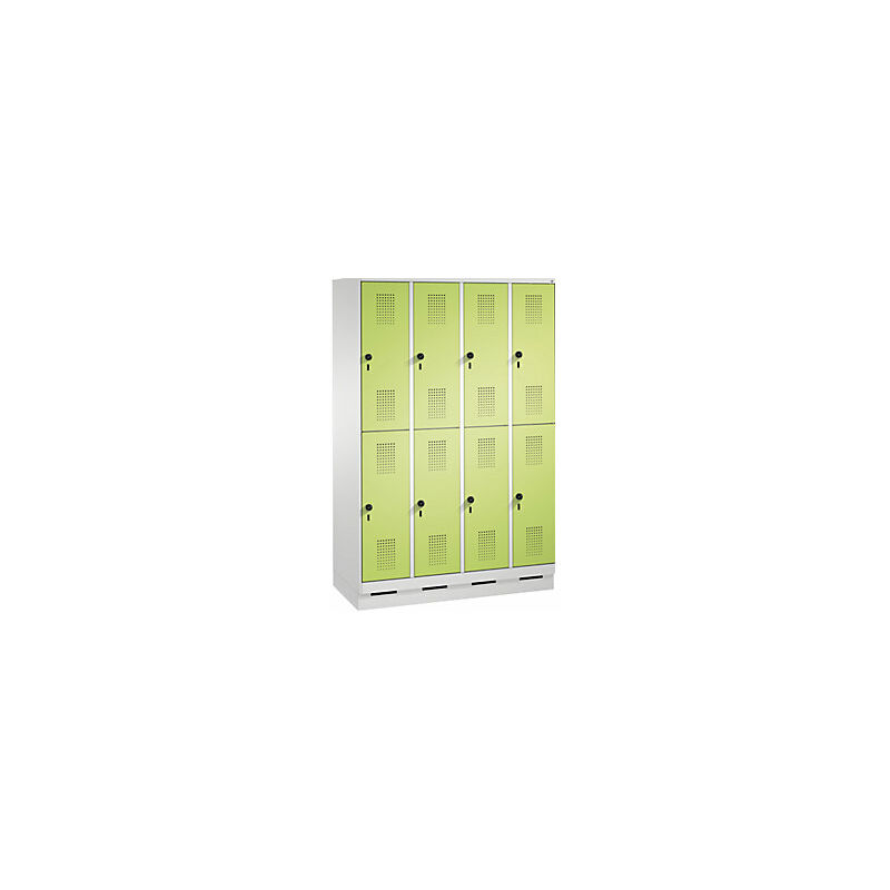 Armadietto guardaroba EVOLO, a due piani, con zoccolino, 4 vani, 2 scomparti per vano, larghezza vani 300 mm, grigio chiaro / verdino. Fornitura = montato. Altezza = 1800 mm. Profondità = 500 mm. Larghezza = 1200 mm. Colore corpo = grigio chiaro RAL 7035. Colore porta = verde azzurrognolo RDS 1108060. Serratura = chiavistello girevole di sicurezza per lucchetto. Numero scomparti in larghezza = 4 pz. Numero scomparti = 8 pz. Larghezza scomparti = 300 mm. Materiale = lamiera d'acciaio. Altezza armadietto = 1800 mm. Dotazione interna = 1 asta appendiabiti, 3 ganci scorrevoli. Larghezza interna = 245 mm. Altezza interna = 813 mm. Profondità interna = 465 mm. Tipo di porta = ante con fessure di ventilazione. Altezza scomparti = 813 mm. Larghezza ripiani = 300 mm. Profondità ripiani = 500 mm. Altezza zoccolo = 100 mm. Struttura = con saldatura. Superficie = con verniciatura a forno. Lo scomparto è dotato di 1 robusta asta appendiabiti a sezione ovale con 3 ganci scorrevoli antitorsione.