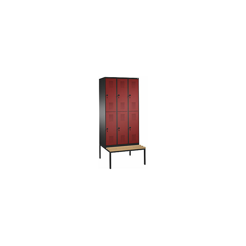 Armadietto guardaroba EVOLO, a due piani, con panca, 3 vani, 2 scomparti per vano, larghezza vani 300 mm, grigio nerastro / rosso rubino. Fornitura = preassemblato, montaggio finale a cura del cliente. Altezza = 2090 mm. Larghezza = 900 mm. Profondità = 815 mm. Colore corpo = grigio nerastro RAL 7021. Colore porta = rosso rubino RAL 3003. Serratura = chiavistello girevole di sicurezza per lucchetto. Numero scomparti in larghezza = 3 pz. Numero scomparti = 6 pz. Materiale = lamiera d'acciaio. Larghezza scomparti = 300 mm. Profondità scomparti = 500 mm. Dotazione interna = 1 asta appendiabiti, 3 ganci scorrevoli. Altezza sedile = 420 mm. Profondità sedile = 315 mm. Profondità armadio = 500 mm. Tipo di porta = ante piene. Colore doghe = faggio. Colore telaio = nero. Versione = con panca integrata. Serie = EVOLO. Larghezza interna = 245 mm. Altezza interna = 813 mm. Lo scomparto è dotato di una robusta asta appendiabiti a sezione ovale con 3 ganci scorrevoli antitorsione. Panca integrata