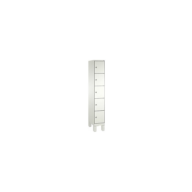 Armadio a scomparti EVOLO, con piedini, 1 vano, 5 scomparti, larghezza vano 300 mm, bianco traffico / bianco traffico. Fornitura = montato. Altezza = 1850 mm. Profondità = 500 mm. Larghezza = 300 mm. Colore corpo = bianco traffico RAL 9016. Colore porta = bianco traffico RAL 9016. Serratura = serratura a cilindro differenziata. Numero scomparti in larghezza = 1 pz. Numero scomparti = 5 pz. Larghezza scomparti = 300 mm. Materiale = lamiera d'acciaio. Altezza armadietto = 1850 mm. Dotazione interna = senza dotazione interna. Larghezza interna = 298 mm. Profondità interna = 465 mm. Tipo di porta = anta a battente. Altezza piedini = 150 mm. Struttura = con saldatura. Superficie = con verniciatura a forno. Armadio a scomparti su piedini in plastica anticorrosione alti 150 mm, con regolazione altezza integrata. Ante lisce a parete singola sovrapposte, supporto su cardini con battuta a destra. 1 serratura a cilindro e 2 chiavi per anta. Viene consegnato montato.