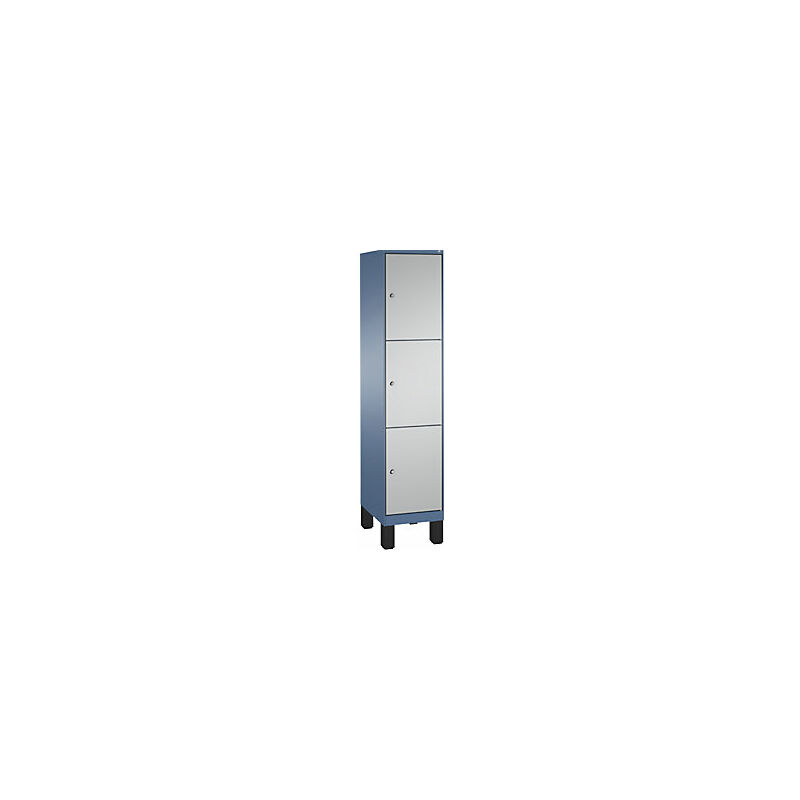 Armadio a scomparti EVOLO, con piedini, 1 vano, 3 scomparti, larghezza vano 400 mm, indaco / alluminio brillante. Fornitura = montato. Altezza = 1850 mm. Profondità = 500 mm. Larghezza = 400 mm. Colore corpo = indaco RAL 5023. Colore porta = alluminio brillante RAL 9006. Serratura = serratura a cilindro differenziata. Numero scomparti in larghezza = 1 pz. Numero scomparti = 3 pz. Larghezza scomparti = 400 mm. Materiale = lamiera d'acciaio. Altezza armadietto = 1850 mm. Dotazione interna = senza dotazione interna. Profondità interna = 465 mm. Tipo di porta = anta a battente. Altezza piedini = 150 mm. Struttura = con saldatura. Superficie = con verniciatura a forno. Armadio a scomparti su piedini in plastica anticorrosione alti 150 mm, con regolazione altezza integrata. Ante lisce a parete singola sovrapposte, supporto su cardini con battuta a destra. 1 serratura a cilindro e 2 chiavi per anta. Viene consegnato montato.