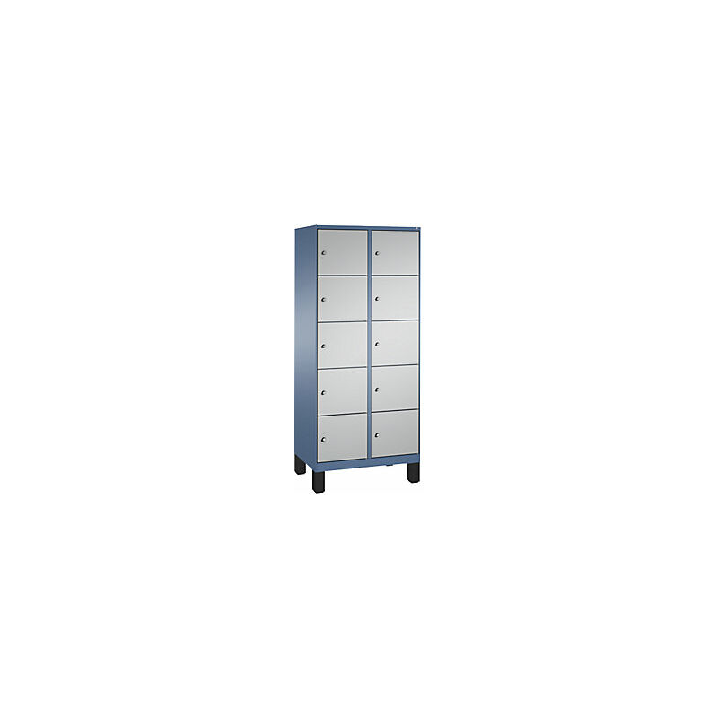 Armadio a scomparti EVOLO, con piedini, 2 vani, 5 scomparti per vano, larghezza vani 400 mm, indaco / alluminio brillante. Fornitura = montato. Altezza = 1850 mm. Profondità = 500 mm. Larghezza = 800 mm. Colore corpo = indaco RAL 5023. Colore porta = alluminio brillante RAL 9006. Serratura = serratura a cilindro differenziata. Numero scomparti in larghezza = 2 pz. Numero scomparti = 10 pz. Larghezza scomparti = 400 mm. Materiale = lamiera d'acciaio. Altezza armadietto = 1850 mm. Dotazione interna = senza dotazione interna. Profondità interna = 465 mm. Tipo di porta = anta a battente. Altezza piedini = 150 mm. Struttura = con saldatura. Superficie = con verniciatura a forno. Armadio a scomparti su piedini in plastica anticorrosione alti 150 mm, con regolazione altezza integrata. Ante lisce a parete singola sovrapposte, supporto su cardini con battuta a destra. 1 serratura a cilindro e 2 chiavi per anta. Viene consegnato montato.
