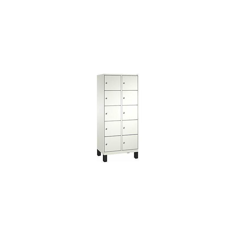 Armadio a scomparti EVOLO, con piedini, 2 vani, 5 scomparti per vano, larghezza vani 400 mm, bianco traffico / bianco traffico. Fornitura = montato. Altezza = 1850 mm. Profondità = 500 mm. Larghezza = 800 mm. Colore corpo = bianco traffico RAL 9016. Colore porta = bianco traffico RAL 9016. Serratura = serratura a cilindro differenziata. Numero scomparti in larghezza = 2 pz. Numero scomparti = 10 pz. Larghezza scomparti = 400 mm. Materiale = lamiera d'acciaio. Altezza armadietto = 1850 mm. Dotazione interna = senza dotazione interna. Profondità interna = 465 mm. Tipo di porta = anta a battente. Altezza piedini = 150 mm. Struttura = con saldatura. Superficie = con verniciatura a forno. Armadio a scomparti su piedini in plastica anticorrosione alti 150 mm, con regolazione altezza integrata. Ante lisce a parete singola sovrapposte, supporto su cardini con battuta a destra. 1 serratura a cilindro e 2 chiavi per anta. Viene consegnato montato.
