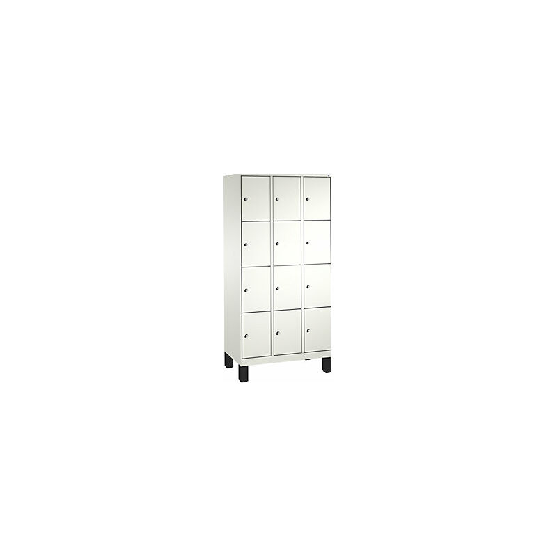 Armadio a scomparti EVOLO, con piedini, 3 vani, 4 scomparti per vano, larghezza vani 300 mm, bianco traffico / bianco traffico. Fornitura = montato. Altezza = 1850 mm. Profondità = 500 mm. Larghezza = 900 mm. Colore corpo = bianco traffico RAL 9016. Colore porta = bianco traffico RAL 9016. Serratura = serratura a cilindro differenziata. Numero scomparti in larghezza = 3 pz. Numero scomparti = 12 pz. Larghezza scomparti = 300 mm. Materiale = lamiera d'acciaio. Altezza armadietto = 1850 mm. Dotazione interna = senza dotazione interna. Profondità interna = 465 mm. Tipo di porta = anta a battente. Altezza piedini = 150 mm. Struttura = con saldatura. Superficie = con verniciatura a forno. Armadio a scomparti su piedini in plastica anticorrosione alti 150 mm, con regolazione altezza integrata. Ante lisce a parete singola sovrapposte, supporto su cardini con battuta a destra. 1 serratura a cilindro e 2 chiavi per anta. Viene consegnato montato.
