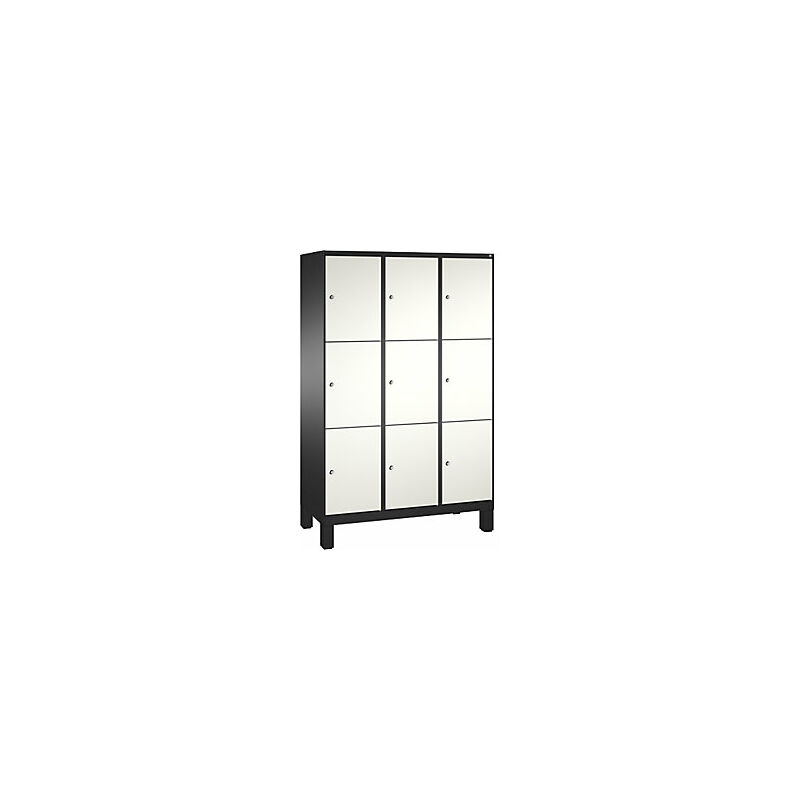 Armadio a scomparti EVOLO, con piedini, 3 vani, 3 scomparti per vano, larghezza vani 400 mm, grigio nerastro / bianco traffico. Fornitura = montato. Altezza = 1850 mm. Profondità = 500 mm. Larghezza = 1200 mm. Colore corpo = grigio nerastro RAL 7021. Colore porta = bianco traffico RAL 9016. Serratura = serratura a cilindro differenziata. Numero scomparti in larghezza = 3 pz. Numero scomparti = 9 pz. Larghezza scomparti = 400 mm. Materiale = lamiera d'acciaio. Altezza armadietto = 1850 mm. Dotazione interna = senza dotazione interna. Profondità interna = 465 mm. Tipo di porta = anta a battente. Altezza piedini = 150 mm. Struttura = con saldatura. Superficie = con verniciatura a forno. Armadio a scomparti su piedini in plastica anticorrosione alti 150 mm, con regolazione altezza integrata. Ante lisce a parete singola sovrapposte, supporto su cardini con battuta a destra. 1 serratura a cilindro e 2 chiavi per anta. Viene consegnato montato.