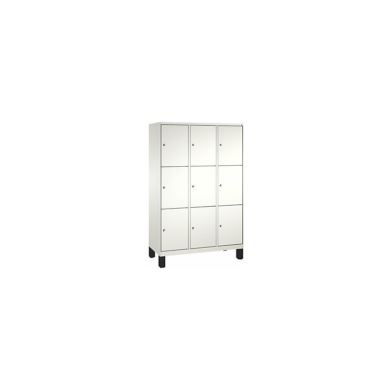 Armadio a scomparti EVOLO, con piedini, 3 vani, 3 scomparti per vano, larghezza vani 400 mm, bianco traffico / bianco traffico. Fornitura = montato. Altezza = 1850 mm. Profondità = 500 mm. Larghezza = 1200 mm. Colore corpo = bianco traffico RAL 9016. Colore porta = bianco traffico RAL 9016. Serratura = serratura a cilindro differenziata. Numero scomparti in larghezza = 3 pz. Numero scomparti = 9 pz. Larghezza scomparti = 400 mm. Materiale = lamiera d'acciaio. Altezza armadietto = 1850 mm. Dotazione interna = senza dotazione interna. Profondità interna = 465 mm. Tipo di porta = anta a battente. Altezza piedini = 150 mm. Struttura = con saldatura. Superficie = con verniciatura a forno. Armadio a scomparti su piedini in plastica anticorrosione alti 150 mm, con regolazione altezza integrata. Ante lisce a parete singola sovrapposte, supporto su cardini con battuta a destra. 1 serratura a cilindro e 2 chiavi per anta. Viene consegnato montato.