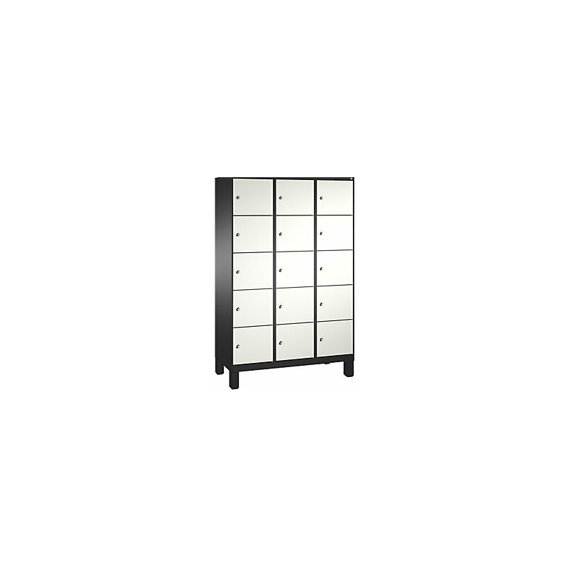 Armadio a scomparti EVOLO, con piedini, 3 vani, 5 scomparti per vano, larghezza vani 400 mm, grigio nerastro / bianco traffico. Fornitura = montato. Altezza = 1850 mm. Profondità = 500 mm. Larghezza = 1200 mm. Colore corpo = grigio nerastro RAL 7021. Colore porta = bianco traffico RAL 9016. Serratura = serratura a cilindro differenziata. Numero scomparti in larghezza = 3 pz. Numero scomparti = 15 pz. Larghezza scomparti = 400 mm. Materiale = lamiera d'acciaio. Altezza armadietto = 1850 mm. Dotazione interna = senza dotazione interna. Profondità interna = 465 mm. Tipo di porta = anta a battente. Altezza piedini = 150 mm. Struttura = con saldatura. Superficie = con verniciatura a forno. Armadio a scomparti su piedini in plastica anticorrosione alti 150 mm, con regolazione altezza integrata. Ante lisce a parete singola sovrapposte, supporto su cardini con battuta a destra. 1 serratura a cilindro e 2 chiavi per anta. Viene consegnato montato.