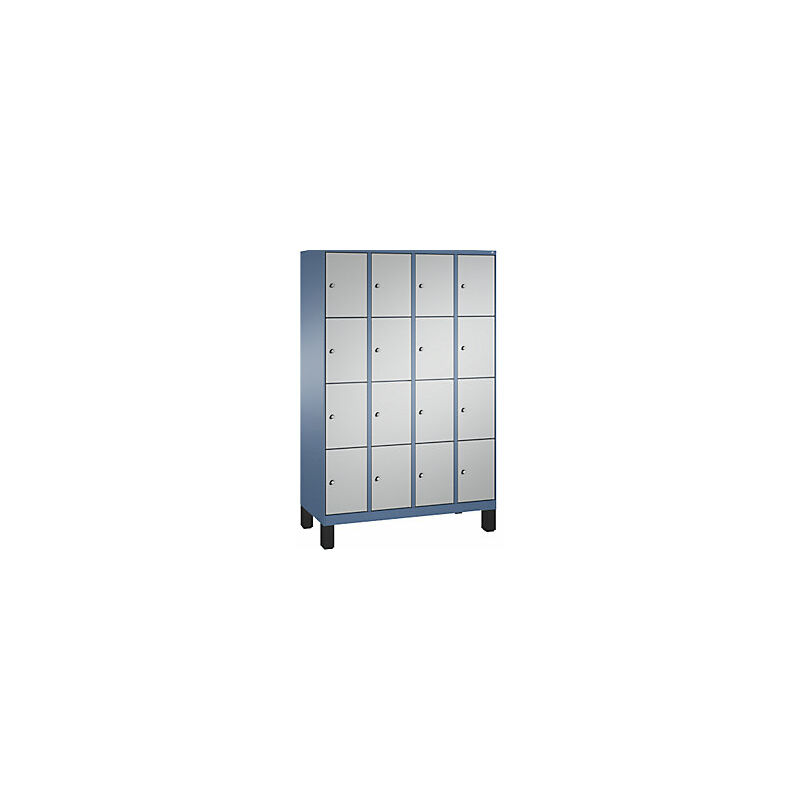 Armadio a scomparti EVOLO, con piedini, 4 vani, 4 scomparti per vano, larghezza vani 300 mm, indaco / alluminio brillante. Fornitura = montato. Altezza = 1850 mm. Profondità = 500 mm. Larghezza = 1200 mm. Colore corpo = indaco RAL 5023. Colore porta = alluminio brillante RAL 9006. Serratura = serratura a cilindro differenziata. Numero scomparti in larghezza = 4 pz. Numero scomparti = 16 pz. Larghezza scomparti = 300 mm. Materiale = lamiera d'acciaio. Altezza armadietto = 1850 mm. Dotazione interna = senza dotazione interna. Profondità interna = 465 mm. Tipo di porta = anta a battente. Altezza piedini = 150 mm. Struttura = con saldatura. Superficie = con verniciatura a forno. Armadio a scomparti su piedini in plastica anticorrosione alti 150 mm, con regolazione altezza integrata. Ante lisce a parete singola sovrapposte, supporto su cardini con battuta a destra. 1 serratura a cilindro e 2 chiavi per anta. Viene consegnato montato.