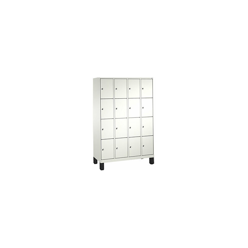Armadio a scomparti EVOLO, con piedini, 4 vani, 4 scomparti per vano, larghezza vani 300 mm, bianco traffico / bianco traffico. Fornitura = montato. Altezza = 1850 mm. Profondità = 500 mm. Larghezza = 1200 mm. Colore corpo = bianco traffico RAL 9016. Colore porta = bianco traffico RAL 9016. Serratura = serratura a cilindro differenziata. Numero scomparti in larghezza = 4 pz. Numero scomparti = 16 pz. Larghezza scomparti = 300 mm. Materiale = lamiera d'acciaio. Altezza armadietto = 1850 mm. Dotazione interna = senza dotazione interna. Profondità interna = 465 mm. Tipo di porta = anta a battente. Altezza piedini = 150 mm. Struttura = con saldatura. Superficie = con verniciatura a forno. Armadio a scomparti su piedini in plastica anticorrosione alti 150 mm, con regolazione altezza integrata. Ante lisce a parete singola sovrapposte, supporto su cardini con battuta a destra. 1 serratura a cilindro e 2 chiavi per anta. Viene consegnato montato.