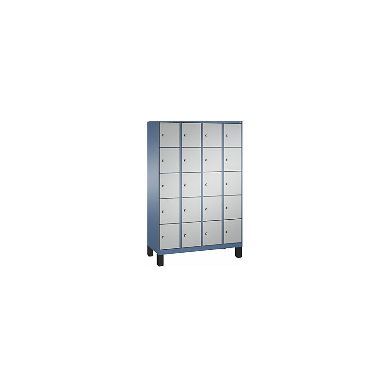Armadio a scomparti EVOLO, con piedini, 4 vani, 5 scomparti per vano, larghezza vani 300 mm, indaco / alluminio brillante. Fornitura = montato. Altezza = 1850 mm. Profondità = 500 mm. Larghezza = 1200 mm. Colore corpo = indaco RAL 5023. Colore porta = alluminio brillante RAL 9006. Serratura = serratura a cilindro differenziata. Numero scomparti in larghezza = 4 pz. Numero scomparti = 20 pz. Larghezza scomparti = 300 mm. Materiale = lamiera d'acciaio. Altezza armadietto = 1850 mm. Dotazione interna = senza dotazione interna. Profondità interna = 465 mm. Tipo di porta = anta a battente. Altezza piedini = 150 mm. Struttura = con saldatura. Superficie = con verniciatura a forno. Armadio a scomparti su piedini in plastica anticorrosione alti 150 mm, con regolazione altezza integrata. Ante lisce a parete singola sovrapposte, supporto su cardini con battuta a destra. 1 serratura a cilindro e 2 chiavi per anta. Viene consegnato montato.