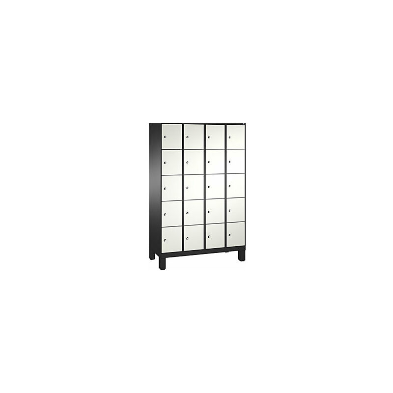 Armadio a scomparti EVOLO, con piedini, 4 vani, 5 scomparti per vano, larghezza vani 300 mm, grigio nerastro / bianco traffico. Fornitura = montato. Altezza = 1850 mm. Profondità = 500 mm. Larghezza = 1200 mm. Colore corpo = grigio nerastro RAL 7021. Colore porta = bianco traffico RAL 9016. Serratura = serratura a cilindro differenziata. Numero scomparti in larghezza = 4 pz. Numero scomparti = 20 pz. Larghezza scomparti = 300 mm. Materiale = lamiera d'acciaio. Altezza armadietto = 1850 mm. Dotazione interna = senza dotazione interna. Profondità interna = 465 mm. Tipo di porta = anta a battente. Altezza piedini = 150 mm. Struttura = con saldatura. Superficie = con verniciatura a forno. Armadio a scomparti su piedini in plastica anticorrosione alti 150 mm, con regolazione altezza integrata. Ante lisce a parete singola sovrapposte, supporto su cardini con battuta a destra. 1 serratura a cilindro e 2 chiavi per anta. Viene consegnato montato.