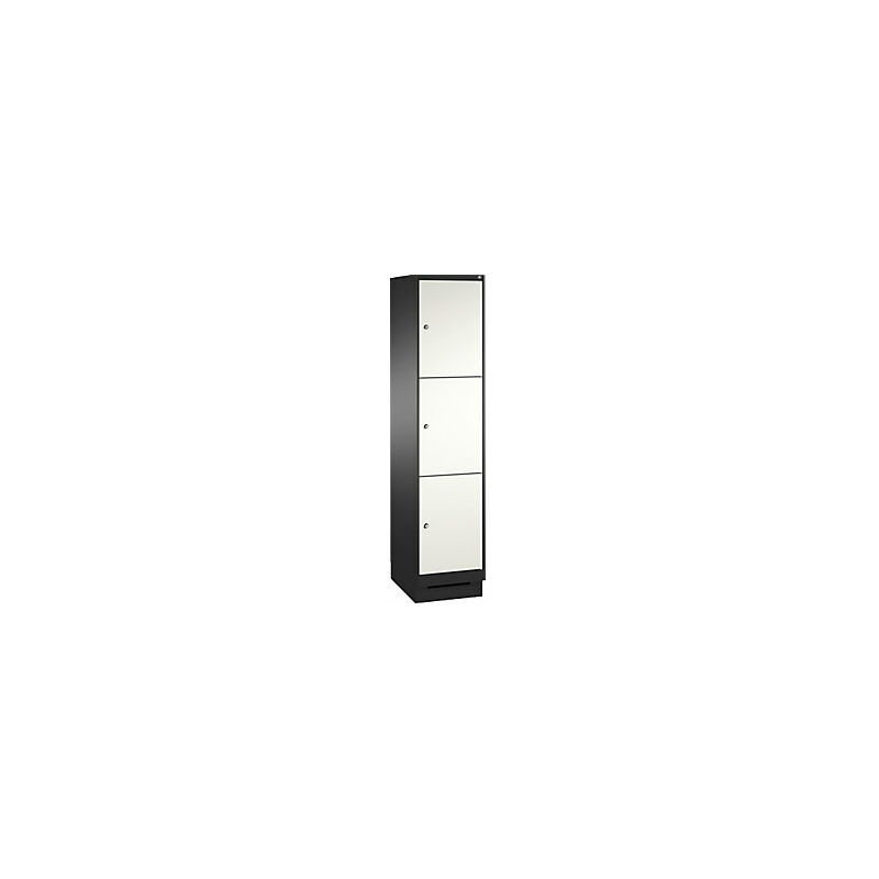 Armadio a scomparti EVOLO, con zoccolino, 1 vano, 3 scomparti, larghezza vano 400 mm, grigio nerastro / bianco traffico. Fornitura = montato. Altezza = 1800 mm. Profondità = 500 mm. Larghezza = 400 mm. Colore corpo = grigio nerastro RAL 7021. Colore porta = bianco traffico RAL 9016. Serratura = serratura a cilindro differenziata. Numero scomparti in larghezza = 1 pz. Numero scomparti = 3 pz. Materiale = lamiera d'acciaio. Altezza armadietto = 1800 mm. Dotazione interna = senza dotazione interna. Profondità interna = 465 mm. Tipo di porta = anta a battente. Altezza zoccolo = 100 mm. Struttura = con saldatura. Superficie = con verniciatura a forno. Armadio a scomparti su zoccolino alto 100 mm, arretrato anteriormente con apertura per una ventilazione ottimale. Ante lisce a parete singola sovrapposte, supporto su cardini con battuta a destra. 1 serratura a cilindro e 2 chiavi per anta. Viene consegnato montato.