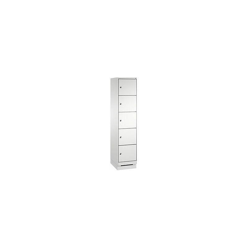 Armadio a scomparti EVOLO, con zoccolino, 1 vano, 5 scomparti, larghezza vano 400 mm, grigio chiaro. Fornitura = montato. Altezza = 1800 mm. Profondità = 500 mm. Larghezza = 400 mm. Colore corpo = grigio chiaro RAL 7035. Colore porta = grigio chiaro RAL 7035. Serratura = serratura a cilindro differenziata. Numero scomparti in larghezza = 1 pz. Numero scomparti = 5 pz. Materiale = lamiera d'acciaio. Altezza armadietto = 1800 mm. Dotazione interna = senza dotazione interna. Profondità interna = 465 mm. Tipo di porta = anta a battente. Altezza zoccolo = 100 mm. Struttura = con saldatura. Superficie = con verniciatura a forno. Armadio a scomparti su zoccolino alto 100 mm, arretrato anteriormente con apertura per una ventilazione ottimale. Ante lisce a parete singola sovrapposte, supporto su cardini con battuta a destra. 1 serratura a cilindro e 2 chiavi per anta. Viene consegnato montato.