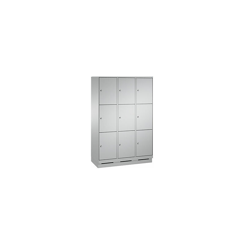 Armadio a scomparti EVOLO, con zoccolino, 3 vani, 3 scomparti per vano, larghezza vani 400 mm, alluminio brillante / alluminio brillante. Fornitura = montato. Altezza = 1800 mm. Profondità = 500 mm. Larghezza = 1200 mm. Colore corpo = alluminio brillante RAL 9006. Colore porta = alluminio brillante RAL 9006. Serratura = serratura a cilindro differenziata. Numero scomparti in larghezza = 3 pz. Numero scomparti = 9 pz. Materiale = lamiera d'acciaio. Altezza armadietto = 1800 mm. Dotazione interna = senza dotazione interna. Profondità interna = 465 mm. Tipo di porta = anta a battente. Altezza zoccolo = 100 mm. Struttura = con saldatura. Superficie = con verniciatura a forno. Armadio a scomparti su zoccolino alto 100 mm, arretrato anteriormente con apertura per una ventilazione ottimale. Ante lisce a parete singola sovrapposte, supporto su cardini con battuta a destra. 1 serratura a cilindro e 2 chiavi per anta. Viene consegnato montato.