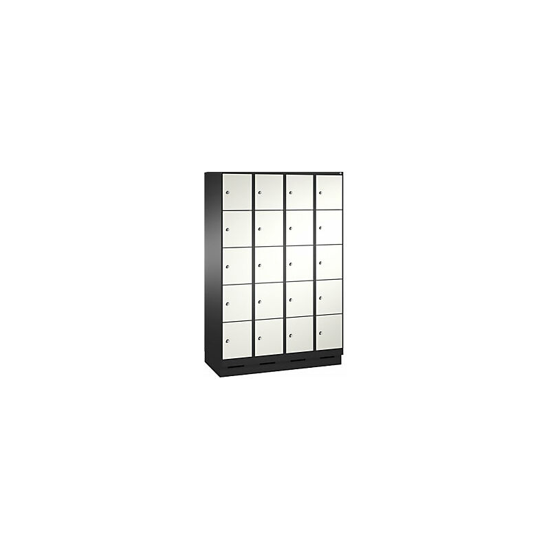 Armadio a scomparti EVOLO, con zoccolino, 4 vani, 5 scomparti per vano, larghezza vani 300 mm, grigio nerastro / bianco traffico. Fornitura = montato. Altezza = 1800 mm. Profondità = 500 mm. Larghezza = 1200 mm. Colore corpo = grigio nerastro RAL 7021. Colore porta = bianco traffico RAL 9016. Serratura = serratura a cilindro differenziata. Numero scomparti in larghezza = 4 pz. Numero scomparti = 20 pz. Materiale = lamiera d'acciaio. Altezza armadietto = 1800 mm. Dotazione interna = senza dotazione interna. Larghezza interna = 245 mm. Altezza interna = 295 mm. Profondità interna = 465 mm. Tipo di porta = anta a battente. Altezza zoccolo = 100 mm. Struttura = con saldatura. Superficie = con verniciatura a forno. Armadio a scomparti su zoccolino alto 100 mm, arretrato anteriormente con apertura per una ventilazione ottimale. Ante lisce a parete singola sovrapposte, supporto su cardini con battuta a destra. 1 serratura a cilindro e 2 chiavi per anta. Viene consegnato montato.