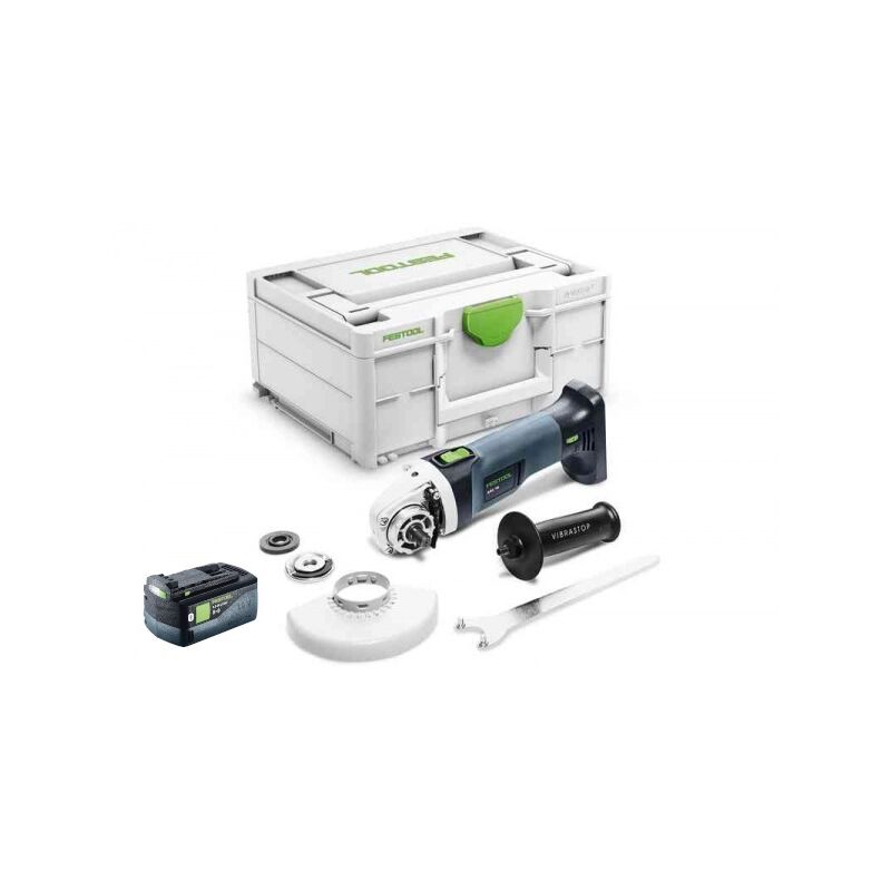 La smerigliatrice angolare a batteria Festool AGC 18-125 EB-Basic-5,0 è la robusta e pratica soluzione offerta dal produttore tedesco per il taglio e la levigatura.Questa smerigliatrice, estremamente resistente alla polvere grazie al motore incapsulato e all'elettronica protetta, è particolarmente indicata per cantieri ed operazioni che generano elevate quantità di polvere.L'elettronica della smerigliatrice AGC 18-125 EB-Basic-5,0 permette di regolarne la velocità in continuo da 4.500 a 8.500 g/min così da adattarla a piacimento alle necessità del momento.Festool ha disegnato questa smerigliatrice 18v professionale con struttura ideale per utilizzi prolungati e continuativi, che necessitano di funzionamento ottimale durante il taglio o la levigatura, grazie inoltre al motore disaccoppiato dall'alloggiamento, risulta essere particolarmente silenziosa emettendo anche basse vibrazioni.Il cambio del disco risulta essere semplice, rapido ed intuitivo, dotato infatti di
