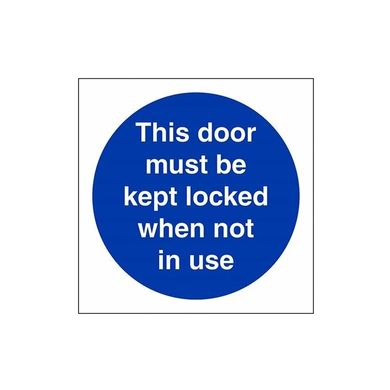 V Safety 18012AF-S Cartello obbligatorio This Door Must Be Kept Locked When Not In Use, in vinile autoadesivo, quadrato, 100 mm x 100 mm, blu 100mm x 100mm