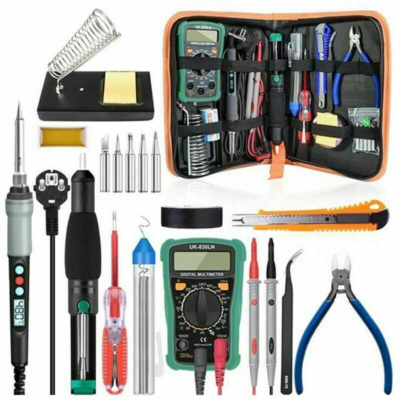 Potenza: 90 W Elemento riscaldante: nucleo in ceramica PCB professionale Temperatura stabile: ¡À5 gradi (senza carico) Temperatura regolabile: 100 gradi C-480 gradi C/212 gradi F-896 gradi F Time Tin: Caratteristiche: Multimetro: multimetro digitale facile da usare per misurare la tensione CC e CA, la corrente CC e CA, la resistenza, il diodo e il test di continuità. Strumento di misura con la funzione di tenere e leggere i dati su un ampio schermo LCD. 5 punte di ferro: cinque diverse punte rendono il saldatore facile da installare per chitarra, computer, hardware e condensatori o accessori TV, ecc. Supporto per saldatore in metallo e spugna per la pulizia: il supporto per saldatore portatile con spugna per la pulizia tiene il saldatore per sicurezza e praticità. La misura massima per evitare ustioni e danni all'utente. Pompa dissaldante: composta da