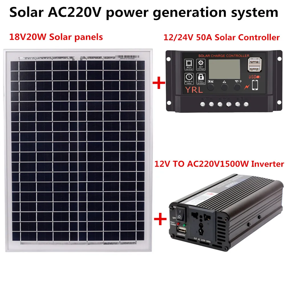 18V20W Solar Panel +12V / 24V Controller + 1500W Inverter AC220V Kit, Suitable For Outdoor And Home Solar Energy-Saving Power Ge