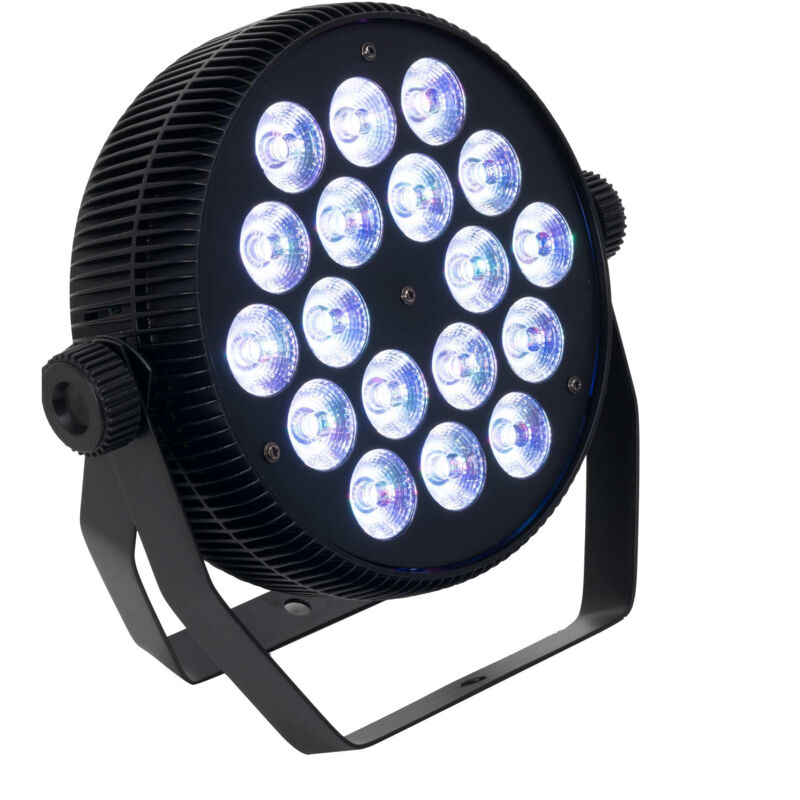 Faretto PAR LED extrapiatto RGBW 18 x 10 W, LED RGBW ( 4 in 1) Design extra-sottile e alloggiamento robusto di alluminio Compatibile con il protocollo DMXDMX Luci ad alta potenza per l'illuminazione professionale di scenari e oggetti Staffa di fissaggio decondoppio arco per il montaggio a terra o l'ancoraggio in alto Modalità automatica, manuale (impostazione strobo a colori e bianco), attivazione sonora, controllo DMX, modalità master/slave 4 u 8 canali per DMX Costruzione in alluminio SPECIFICHE TECNICHE: Faretto PAR LED extrapiatto RGBW. Funzionamento in modalità automatica, manuale (regolazione del colore e strobo de), sonora perattivazione, DMX controllo e master/slave. Selezione dei colori, dello strobo e della modalità di funzionamento tramite display integrato. Selezione dei colori, del dimmer, dello strobo e della velocità di transizione regolabile tramite controller DMX. Design extra sottile e alloggiamento robusto de alluminio. Supporto decondoppio arco per il montaggio a