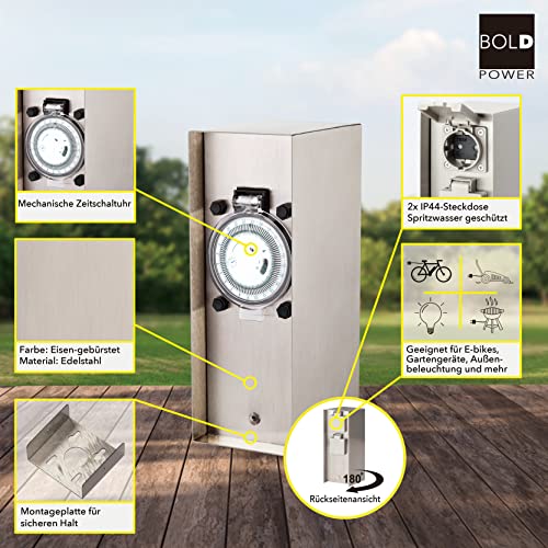 BOLD 19066 Orio presa da giardino in acciaio inox (colonna presa) con distributore a 2 spine con timer (colonna energetica da esterno IP44 | fino a 3680 Watt | 23 x 12 x 8,5 cm | montaggio facile)