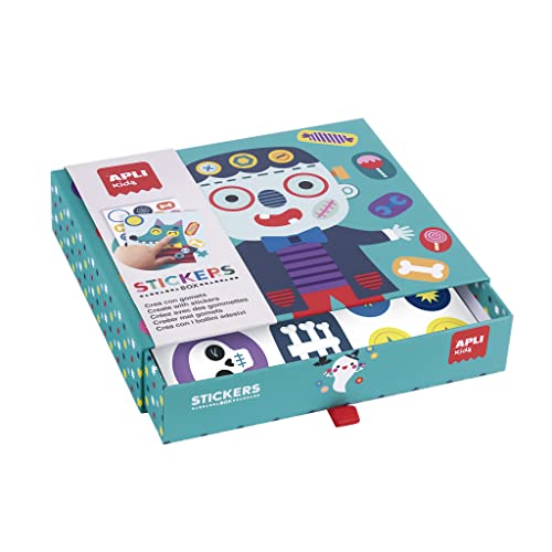 Apli kids 19139-Set di Gommini di Varie Forme in Scatola di Cartone Modello MOSTRUOS-Set di Adesivi per completare Le Illustrazioni, Colore Mostro, 19139