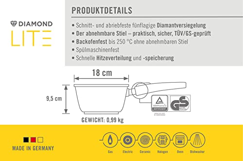 Woll 1918DPS Diamond Lite Casseruola in ghisa con Manico Rimovibile, Diametro 18 cm, 9,5 cm di Altezza, 2 l capacità