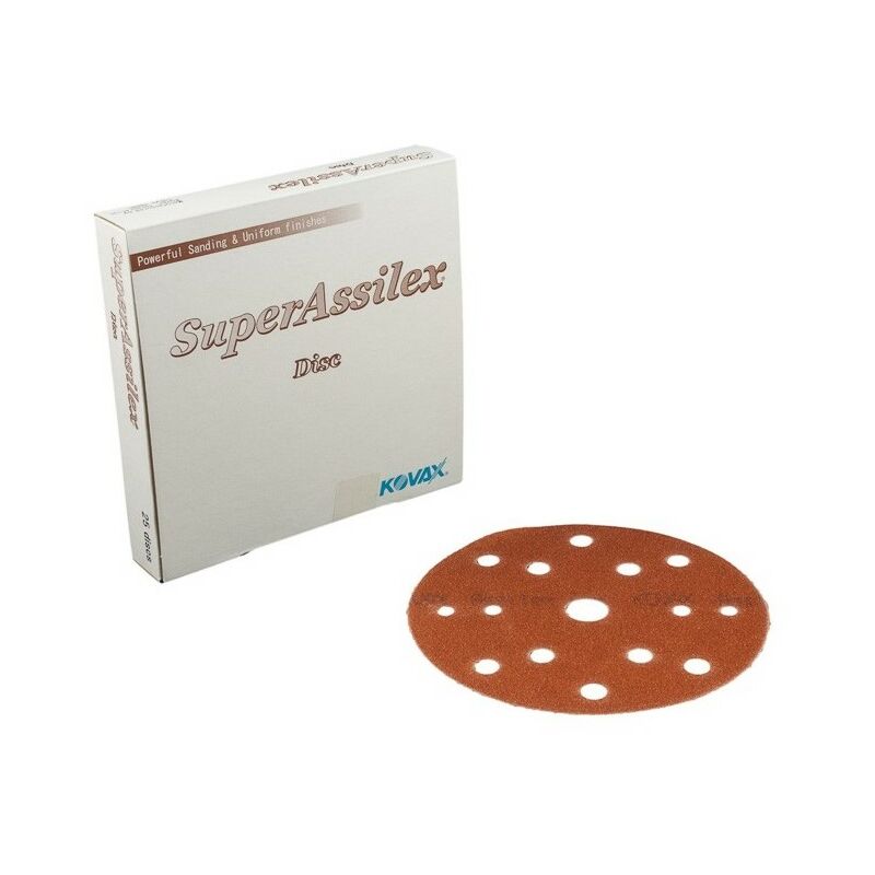 • KOVAX DISCHI ABRASIVI SUPER ASSILEX SUPER TACK • 152 MM • 15 FORI • GRANA: K240 • PEZZI 25 • PER CARTEGGIATURA STUCCO FONDI E PRIMER • USARE CON INTERFACCIA RIFIDA PER APPIATTIRE LA SUPERFIIE E CON INTERFACCIA MORBIDA PER SUPERFICI CURVE • CODICE: K193-2537 VANTAGGI ASSILEX L'innovativo supporto in lattice e la struttura unica dell'abrasivo producono segni molto uniformi e superficiali. Massimo controllo durante la carteggiatura del fondo e della base opaca e risparmio di tempo fino al 50%. Super Assilex previene potenziali problemi durante il resto del ciclo di carteggiatura.